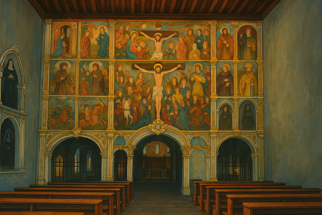 - 教会内部にはフレスコ画や美しい回廊が残る。